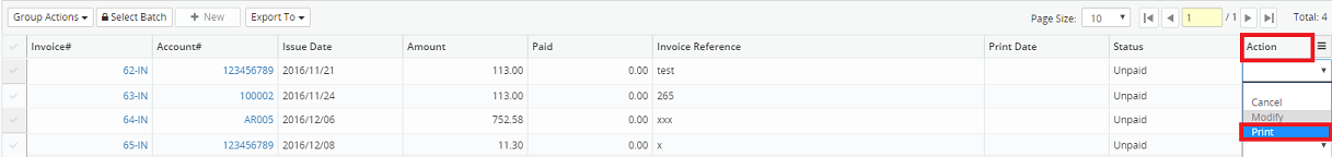 7. Click on the Action drop-down menu beside the corresponding A/R Invoice and select Print.