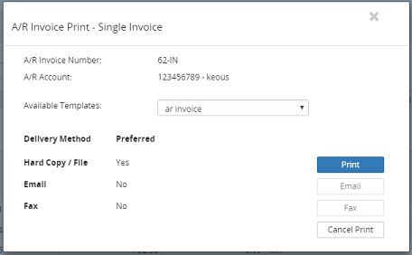 8. If applicable, in the A/R Invoice Print- Single Invoice dialog box, click on the Available Templates drop-down menu to select an alternative option.