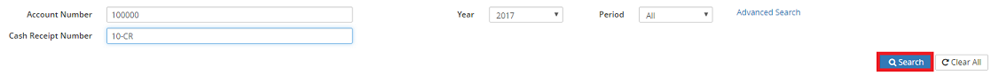 Note: The Cash Receipt Number field will become available when an Account Number is entered.