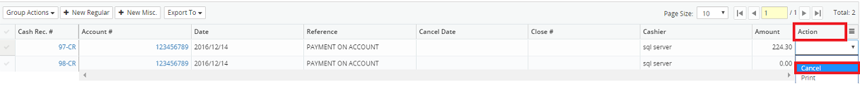 7. Click on the Action drop-down menu beside the corresponding A/R Cash Receipt and select Cancel.