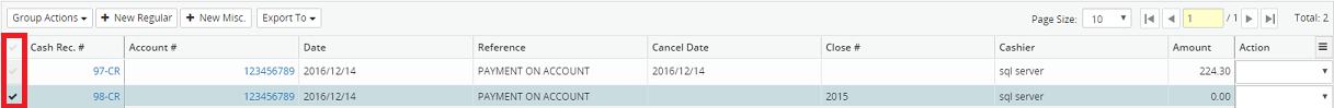 7. Select as many or as few cash receipts from the results displayed in the grid, by clicking the corresponding check mark beside each cash receipt, or click the check mark at the top of the grid to select all cash receipts.