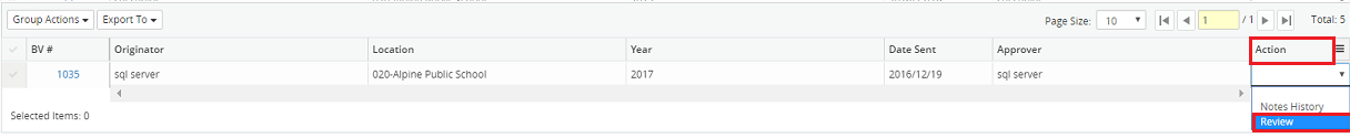 5. Click on the Action drop-down menu beside the corresponding budget voucher and select Review.