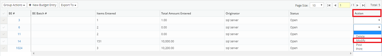 6. Click on the Action drop-down menu beside the corresponding budget entry and select Modify.