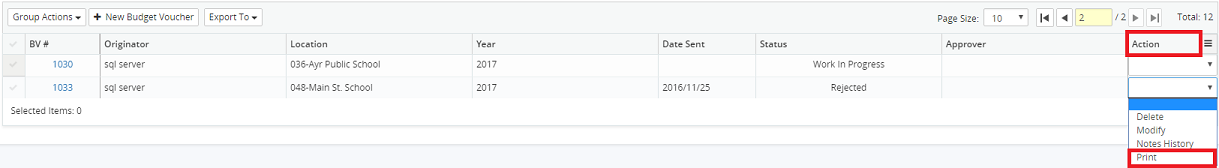 7. Click on the Action drop-down menu beside the corresponding budget voucher and select Print.