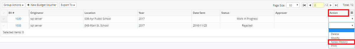 7. Click on the Action drop-down menu beside the corresponding budget voucher and select Note History.