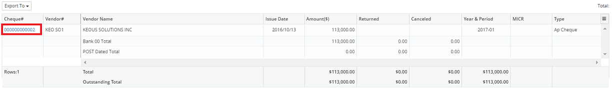 3. Click on the Search button. The cheque(s) that meet the search criteria will be retrieved and displayed in the grid.