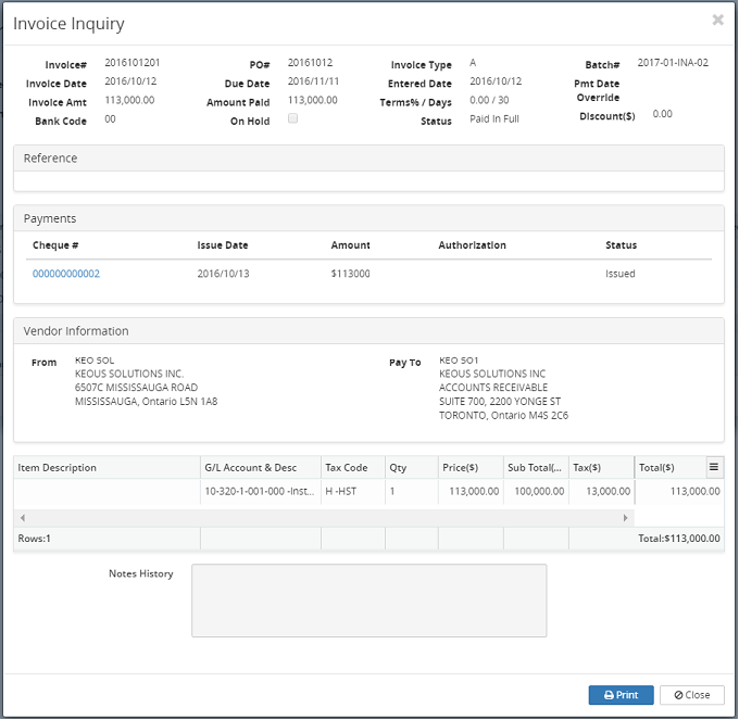 13. If applicable, click on the Print button to print cheque or invoice information or click on the Close button to return to the previous screen.