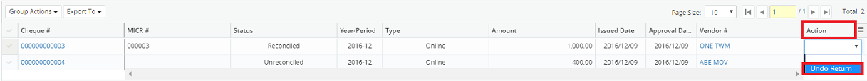 4. Click on the Action drop-down menu beside the corresponding invoice and select Undo Return.