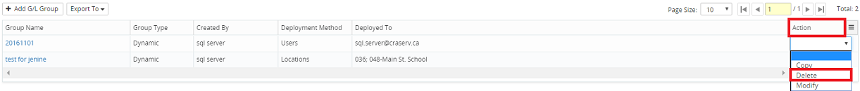 6. Click on the Action drop-down menu beside the corresponding G/L account and select Delete.