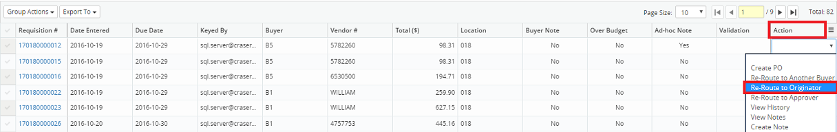 3. Click on the Action drop-down menu beside the corresponding requisition and select Reroute to Originator.