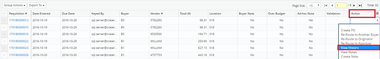 3. Click on the Action drop-down menu beside the corresponding requisition and select View History.