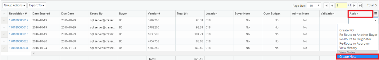 3. Click on the Action drop-down menu beside the corresponding requisition and select Create Note.