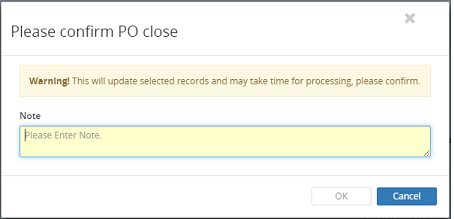 20. Click on the OK button to confirm PO close or click on the Cancel button to cancel the multiple PO close process.