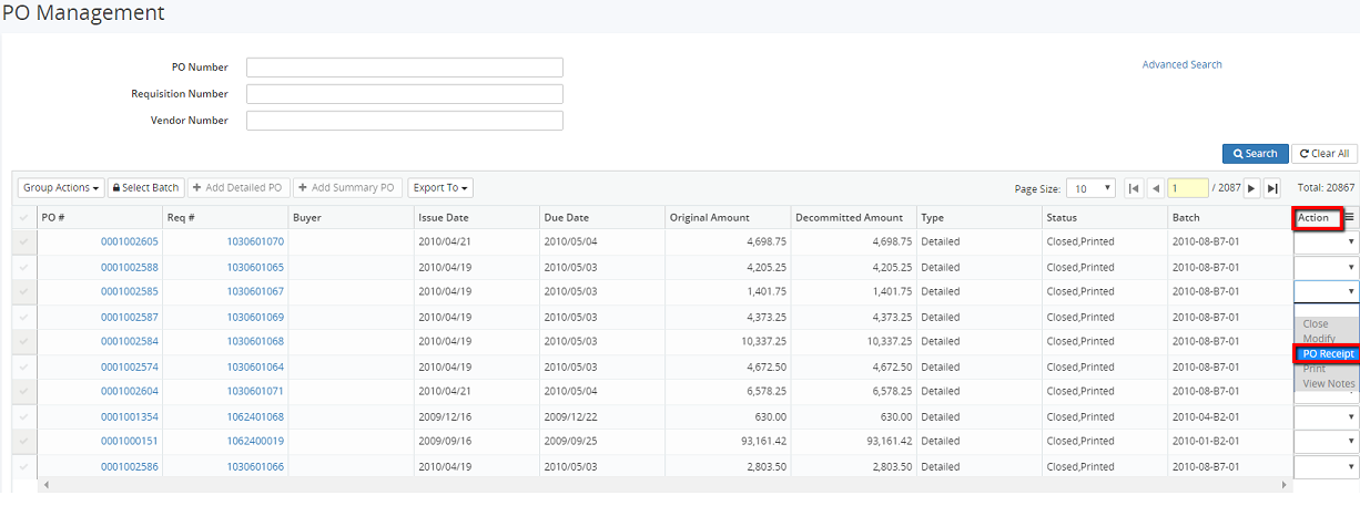 6.  Click on the Action drop-down menu beside the corresponding PO and select PO Receipt.