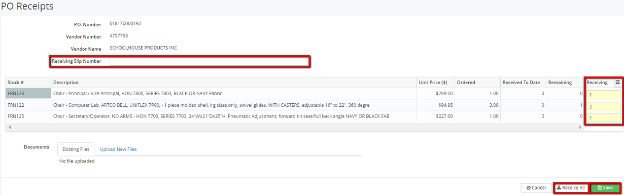 8. Enter the number of each product received in the Receiving column or click on the Receive All button if all products have been received.