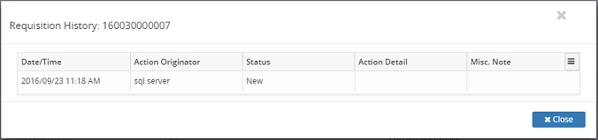 5. In the Requisition History dialog box, all history related to the requisition will display in the grid. Click on the Close button to return to the Requisition Management screen.