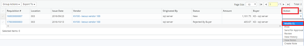 5. Click on the Action drop-down menu beside the corresponding requisition and select Modify G/L.