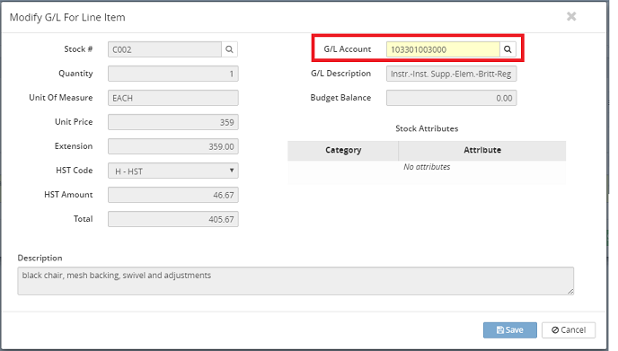 7. In the Modify G/L For Line Item dialog box, update the G/L Account or click on the Search icon to search for a G/L Account.