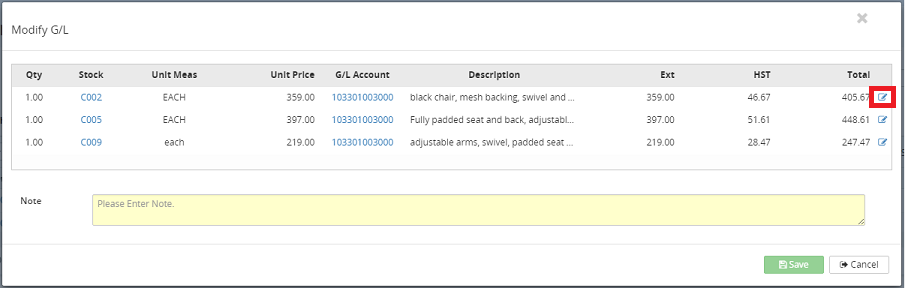 9. In the Modify G/L dialog box, enter a note in the Note field.