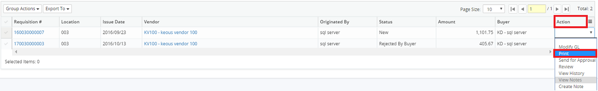 5. Click on the Action drop-down menu beside the corresponding requisition and select Print.