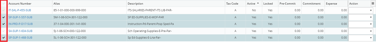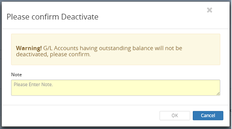 Multiple G/L accounts that have no pre-commitment and/or commitment balances may be flagged as Deactivated; any data entry to the accounts will be prohibited. Deactivated G/L accounts may be reactivated.
