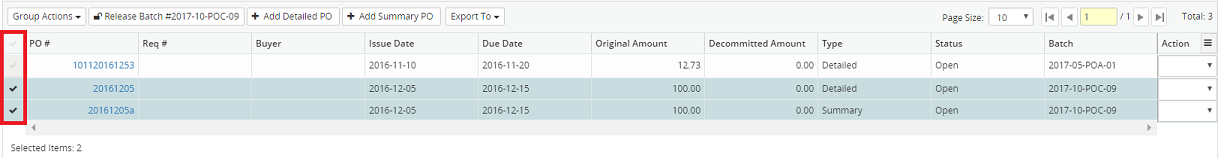 6. Select as many or as few PO's from the results displayed in the grid, by clicking the corresponding check mark beside each PO or click the check mark at the top of the grid to select all PO's.