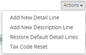 21. Click on the Actions drop-down menu above the grid and select Add New Detail Line to add a new detail line or Add New Description Line to add a new description line. The respective entry screens will be displayed. Enter the necessary data to finalize the line item entry. For step by step instructions on how to enter data in the Detail Line Entry screen, refer to How to Add New Detail Line or in the Description Line Entry screen refer to How to Add New Description Line.