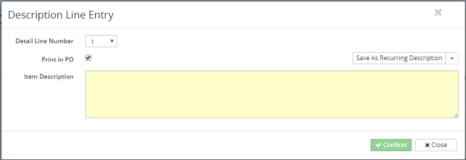 14. Click on the Confirm button to add the information to the purchase order grid or click on the Close button to return to the previous screen.