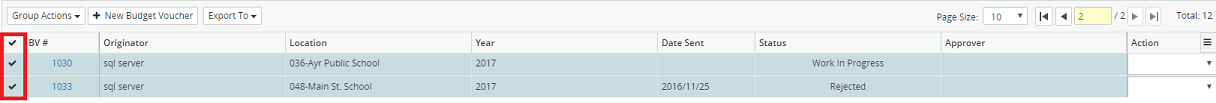 7. Select as many or as few budget vouchers from the results displayed in the grid, by clicking the corresponding check mark beside each budget voucher, or click the check mark at the top of the grid to select all budget vouchers.
