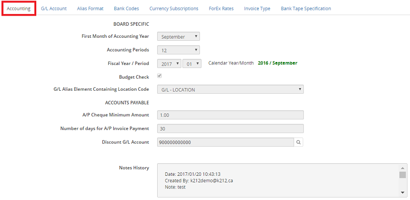 The Accounting tab is used to define the basic accounting principals for the application. It is divided into two sections: Board Specific & Accounts Payable. Within the Board Specific sections there are drop-down menus, and most labels identify the general purpose of the prompt.