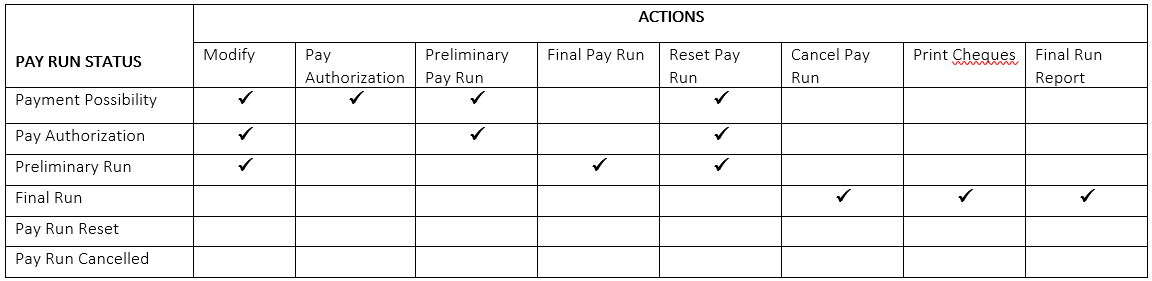 Use the table below to clarify the actions available based on a cheques pay run status.
