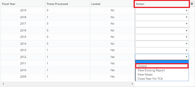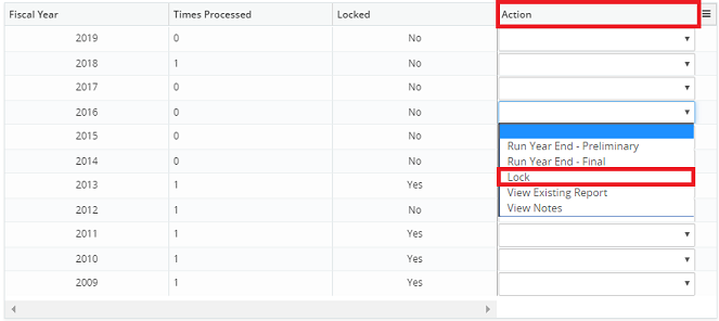 2. Click on the Action drop-down menu beside the corresponding year and select Lock or Unlock.