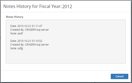 3. In the Note History for Fiscal Year dialog box, all notes added to this fiscal year will display here and are read-only.