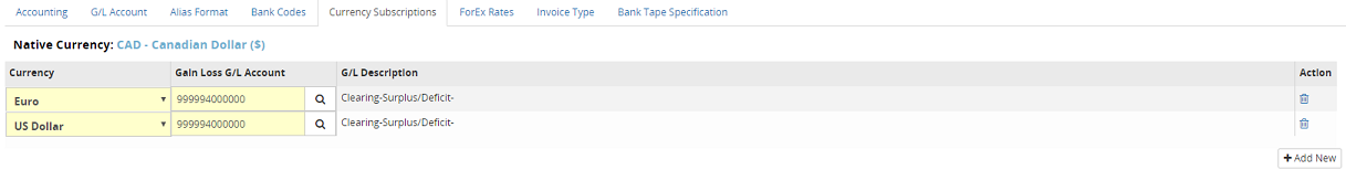 If foreign currencies are being used, the Currency Subscriptions tab identifies the currency as well as the Gain Loss General Ledger account, which will be used on the batch code.