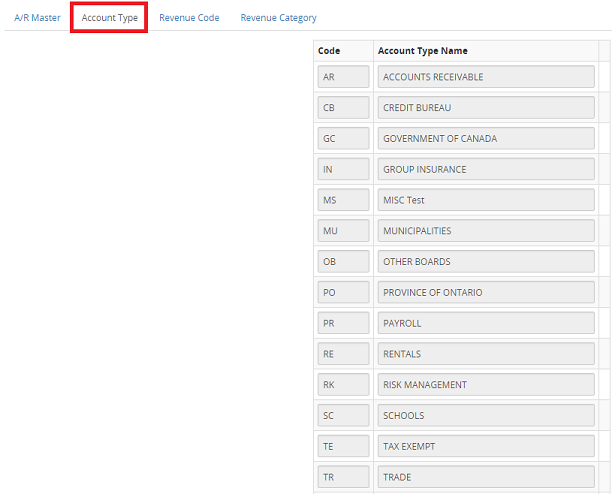 Generally, these type codes relate to the invoice process and the reason for the customer account, such as: employee benefits, rentals of school gymnasiums, as well as defining if the account is an actual accounts receivable account, or a miscellaneous account.