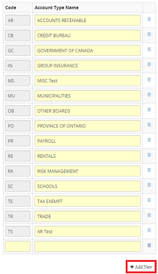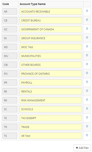 4. If applicable, update the Code and/or Account Type Name for any line items. The Code field will be unavailable to change if it is in current use within the application.