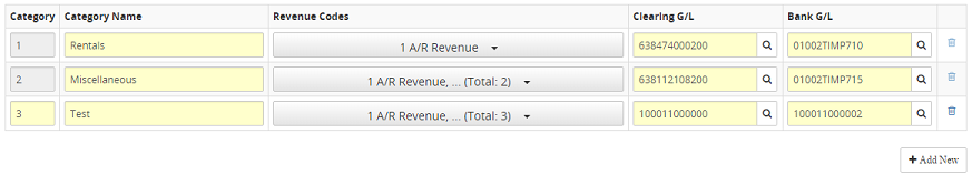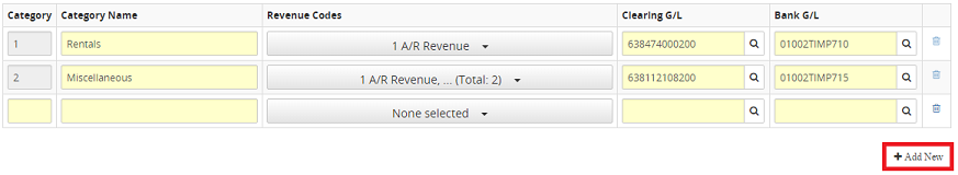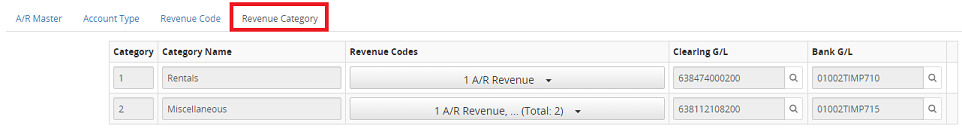 The Revenue Category tab is where revenue categories can be created. The A/R Revenue Categories are used for the purposes of invoicing. Each category has a number and a name which will be seen in the invoice process. Multiple Revenue Codes can be selected for a category.