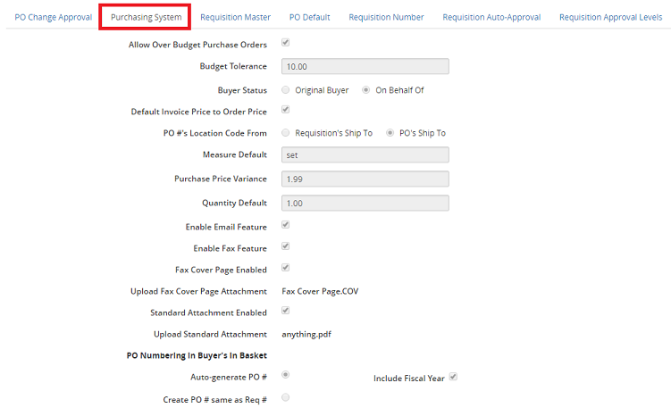 The Purchasing System tab has the following options: