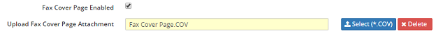 Note: If the Fax Cover Page Enabled selection box is selected, the Upload Fax Cover Page Attachment field will become visible and mandatory. Click on the Select button to enter or update the cover page, or click on the Delete button to remove a cover page selection.