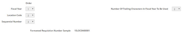 The Order represents the position of the fields in the requisition number. Fiscal Year can be a maximum of four (4) characters. Location Code can be a maximum of five (5) characters. Sequential Number can be a maximum of 5 numbers, however the whole requisition number can only be a maximum of twelve (12) characters in length.