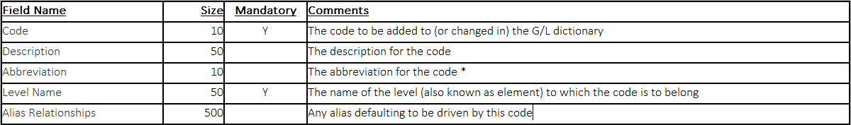 The G/L Account Dictionary Import enables the user to add items to the G/L dictionary, or to update items already there.
