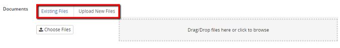 Note: Documents or Attachments sections may display Existing Files and Upload New Files tabs, where the upload file feature is available. Others may only display the Upload New Files tab.