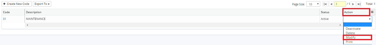 2. Click on the Action drop-down menu beside the corresponding commodity code and select Modify.