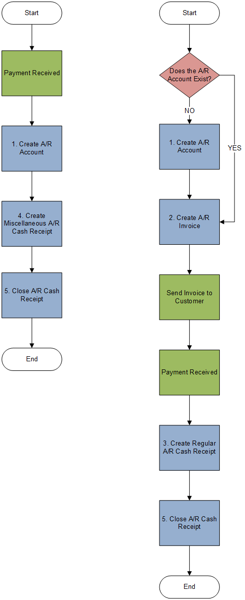 Below are workflows demonstrating the various steps to complete the Accounts Receivable (A/R) process:
