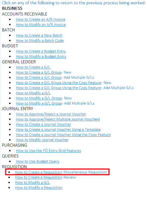 Note: Some general functions or processes in the list will have the same name but extra information as well (i.e. How to Create a Requisition- Miscellaneous Requisition and How to Create a Requisition- Review). This is because the option to select a G/L appears in the How to Create a Requisition process more then once and to ensure the user is being brought back to the next step in the process, they need to click the correct option. In this case, the user will select How to Create a Requisition- Miscellaneous Requisition.