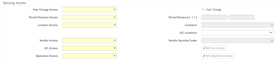 If Full, None or G/L Locations Only is selected, the Edit G/L Access button will not be available and if Custom is selected, the Edit G/L Access button will be available to select. Refer to How to Use G/L Access Editor for further information on this feature.