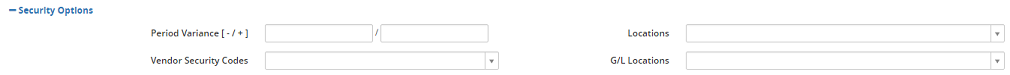 7. If applicable, click on the following drop-down menus to select an option(s): Locations, Vendor Security Code, and/or G/L Locations. Use the Search field to enter specific information, use the Select All button (selected by default) to select all available options or use the Select None button to remove all selected options.