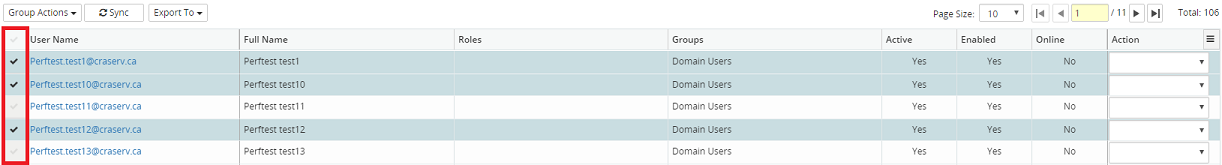 2. Select as many or as few users from the results displayed in the grid, by clicking the corresponding check mark beside each user, or click the check mark at the top of the grid to select all users.