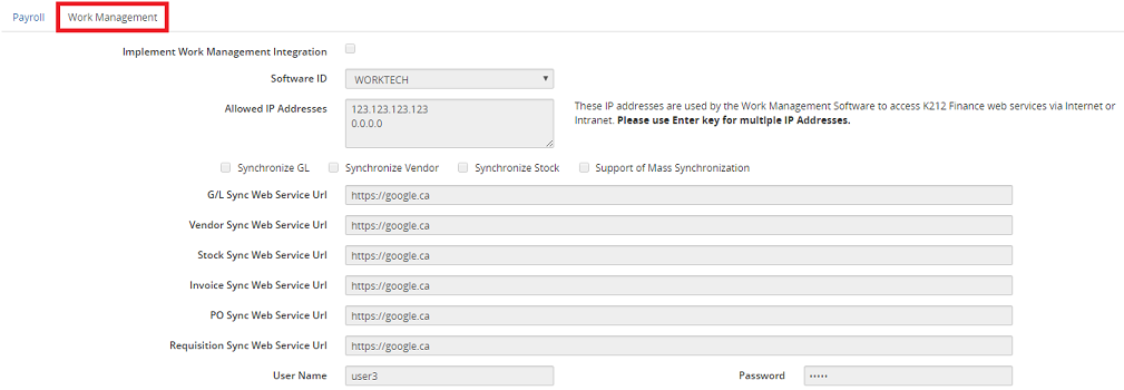 4. If applicable, select or deselect the Implement Work Management Integration selection box. This field needs to be selected for all other fields to be available below.