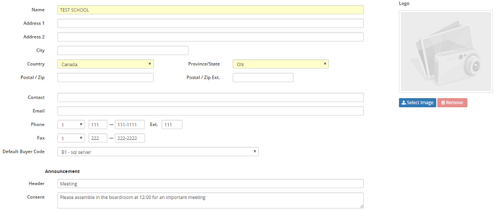 The Board Information tab is used to enter board location and contact information. This tab also is where announcements can be created and board logos can be uploaded. The Announcement and Board logo will be displayed in the K212 Finance Dashboard.